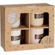 Set od 4 keramičkih šalica kapaciteta 200ml s natpisom, dimenzija fi7.7x8.1cm. Cijena je za 1 set od 4 šalice.