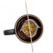 Set od 4 šalice zapremine 300 ml. Šalice su izrađene od keramike. Sjajna obojena glazura u raznim bojama s unutarnje strane i crna mat boja s vanjske strane. Cijena je za 1 set od 4 šalice.