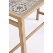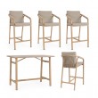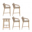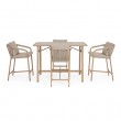 Aluminij (poliester) s efektom drva s praškastim premazom. Ploča barskog stola s porculanskim glaziranim pločicama (iz španjolske). Naslon za ruke i nasloni za stolice od poliesterskog užeta (okrugli 5 mm). Uklonjivi jastuci za sjedalo i nasloni s vodo odbojnom tkaninom na temeljni naslon (100% polipropilen). Barski stol s podesivim nogama. Nogice barskog stola i nosač nogu stolica (vijci od nehrđajućeg čelika) potrebno je sastaviti.