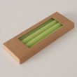 Set od 4 svijeće zelene boje, promjera 2.3cm, visine 25cm. Vrijeme gorenja 9h. Cijena je za 1 set od 4 svijeće.
