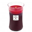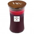 Svijeća ima fitilj od prirodnog drva koji potječe iz SAD-a, a proizvodi se od odgovorno uzgojenog drva. Patentirani drveni oblik fitilja pruža optimalno izgaranje pri čemu stvara stalan blag umirujući zvuk pucketanja vatre. Vrhunski parafinski i sojini voskovi stopljeni su tako da proizvode predivan plamen bez neurednog ostatka. Brzo oslobađanje mirisa trenutačnim stvaranjem iznimno aromatiziranog bazena voska. Sadrži pomno odabrane visoko koncentrirane sastojke testirane kako bi se osiguralo da prostoriju ispunjavaju dugotrajnim mirisom prirodnih aroma. Arome svijeća obogaćene su esencijalnim uljima, uz druge sastojke, uključujući i sintetička mirisna ulja. Upotrebljavaju se samo arome vrhunske kvalitete koje proizvode majstori parfumeri u slojevima bistrih zasebnih gornjih nota i kompleksnijih srednjih i donjih nota posebno dizajniranih za : Snažne prirodne mirise; Bogate sofisticirane sekundarne note s posebnim karakterom; Trajno snažno hladno i vruće širenje mirisa. Vrijeme gorenja 130 sati. Kolekcija WoodWick Trilogy nudi kombinacije mirisa, od kojih svaka stvara svoje jedinstveno iskustvo dok se slojevi tope zajedno. Sun Ripened Berries sastoji se od 3 kombinacije mirisa: Currant miris spada u voćnu olfaktivnu grupu. Gornje note: zeleni tonovi, vodeni tonovi, mandarina. Srednje note: jasmin, ciklama, lotos. Donje note: mošus, crni ribiz. Spiced Blackberry miris spada u voćnu olfaktivnu grupu. Gornje note: bobice, kupina, breskva, kora naranče. Srednje note: kokos, voćni tonovi, cimet, klinčić, karamel, biljni tonovi. Donje note: vanilija, šećer, drvene note, tonka grah. Black Cherry miris spada u voćnu olfaktivnu grupu. Gornje note: trešnja, badem. Srednje note: trešnja, cimet. Donje note: slatka trešnja..