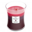 Svijeća ima fitilj od prirodnog drva koji potječe iz SAD-a, a proizvodi se od odgovorno uzgojenog drva. Patentirani drveni oblik fitilja pruža optimalno izgaranje pri čemu stvara stalan blag umirujući zvuk pucketanja vatre. Vrhunski parafinski i sojini voskovi stopljeni su tako da proizvode predivan plamen bez neurednog ostatka. Brzo oslobađanje mirisa trenutačnim stvaranjem iznimno aromatiziranog bazena voska. Sadrži pomno odabrane visokokoncentrirane sastojke testirane kako bi se osiguralo da prostoriju ispunjavaju dugotrajnim mirisom prirodnih aroma. Arome svijeća obogaćene su esencijalnim uljima, uz druge sastojke, uključujući i sintetička mirisna ulja. Upotrebljavaju se samo arome vrhunske kvalitete koje proizvode majstori parfumeri u slojevima bistrih zasebnih gornjih nota i kompleksnijih srednjih i donjih nota posebno dizajniranih za : Snažne prirodne mirise; Bogate sofisticirane sekundarne note s posebnim karakterom; Trajno snažno hladno i vruće širenje mirisa. Vrijeme gorenja 60 sati. Kolekcija WoodWick Trilogy nudi kombinacije mirisa, od kojih svaka stvara svoje jedinstveno iskustvo dok se slojevi tope zajedno. Sun Ripened Berries sastoji se od 3 kombinacije mirisa: Currant miris spada u voćnu olfaktivnu grupu. Gornje note: zeleni tonovi, vodeni tonovi, mandarina. Srednje note: jasmin, ciklama, lotos. Donje note: mošus, crni ribiz. Spiced Blackberry miris spada u voćnu olfaktivnu grupu. Gornje note: bobice, kupina, breskva, kora naranče. Srednje note: kokos, voćni tonovi, cimet, klinčić, karamel, biljni tonovi. Donje note: vanilija, šećer, drvene note, tonka grah. Black Cherry miris spada u voćnu olfaktivnu grupu. Gornje note: trešnja, badem. Srednje note: trešnja, cimet. Donje note: slatka trešnja.