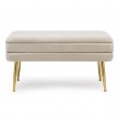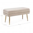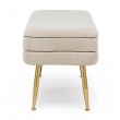 Tabure spremnik Pavlina bež boje, dimenzija 79.5x37.5xh42cm. Okvir od MDF-a i šperploče. Noge od kromiranog čelika zlatne boje. Navlaka od poliestera s baršunastim efektom. Punjenje gustoće 30kg/m3.