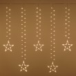 Ukras svijetleći dimenzija 500xh105cm sa 20 zvjezdica. 620 toplo bijelih LED lampica fi 5mm. Mogu se spojiti sa još jednim kompletom lampica (max 2 kom / 1240 LED lampica / 10m). Fiksno svjetlo+7 mogućih svjetlosnih efekata po izboru. 8-16h On-Off timer. SELV transformator, 31V, IP44 za vanjsku i unutarnju uporabu. Napojni prozirni kabel 4m dužine.