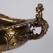 Zdjela ovalna sa nogom zlatne boje, dimenzija 52x75x41cm. Bilo da je lijepo ukrasite cvijećem ili u njeoj izložite hranu, ova zdjela za centar stola definitivno će privući poglede! Izrađena je od brušenog mesinga, ima ručno izrađene detalje i dvije ručke s anđelom na vrhu.